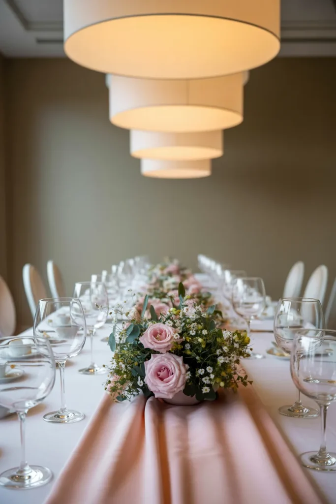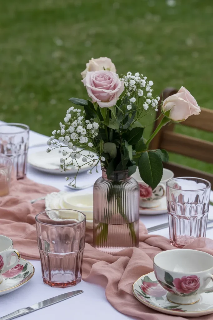 I like using flowers as the main focus because they instantly upgrade the setup. A soft table runner with fresh blooms in the center works every time.