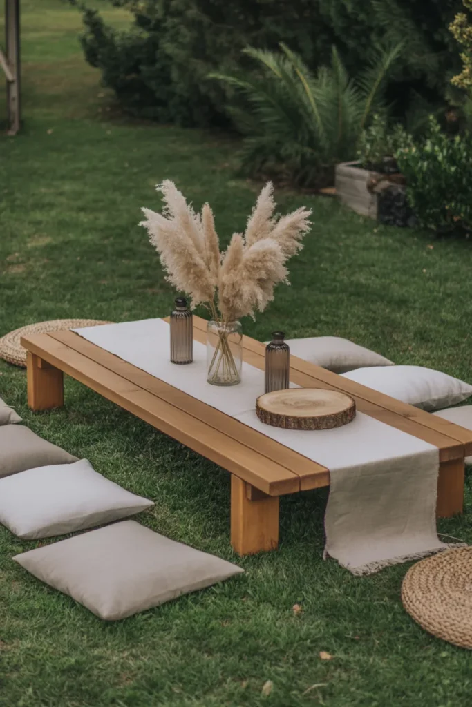 This is one of the easiest setups I’ve tried outdoors. A low table with neutral fabric and cushions feels comfortable and relaxed.