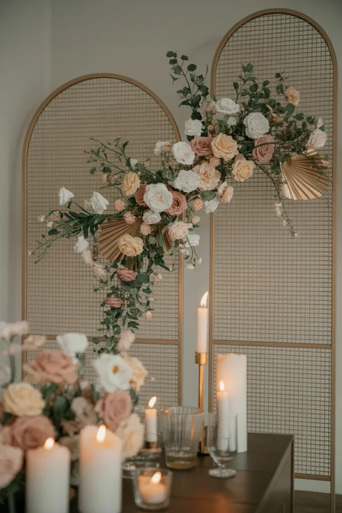 Tall gold arches with cascading flowers, a simple draped table, and slim candles give a balanced, romantic glow. I add flower pots at the base for fullness.