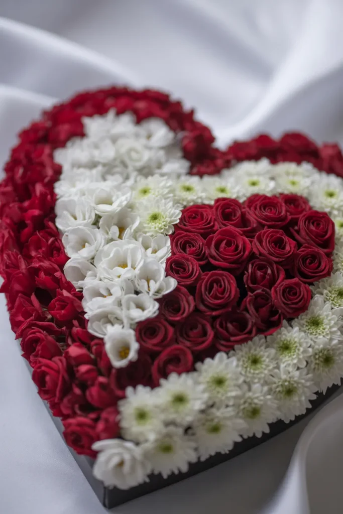 A giant heart made of red roses with white bloom centers creates a romantic stage. Uplighting adds drama and depth to photos.