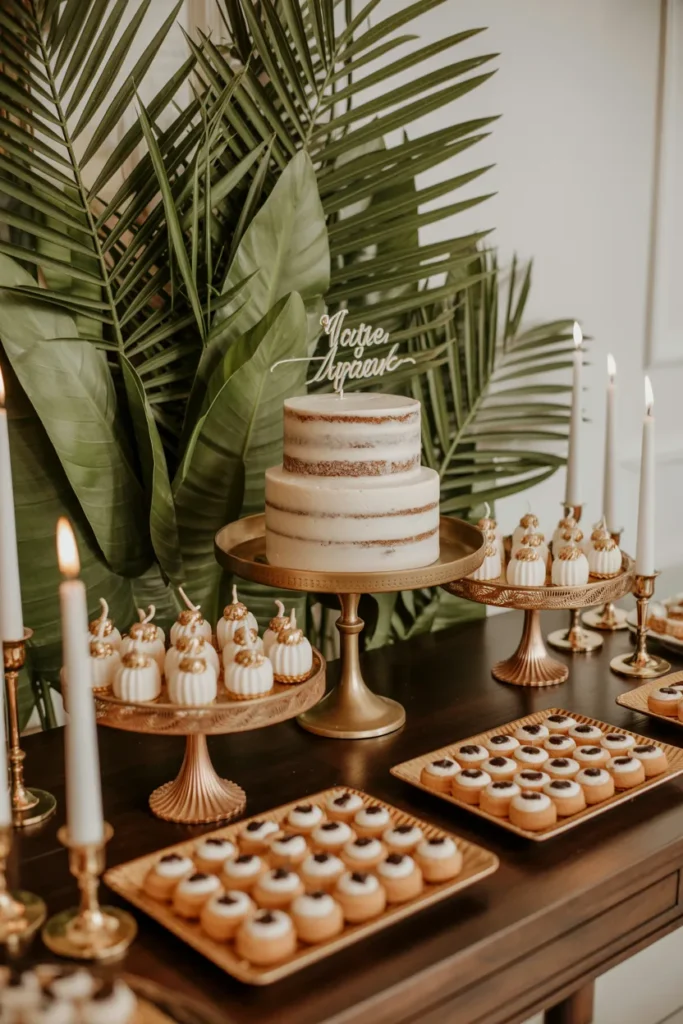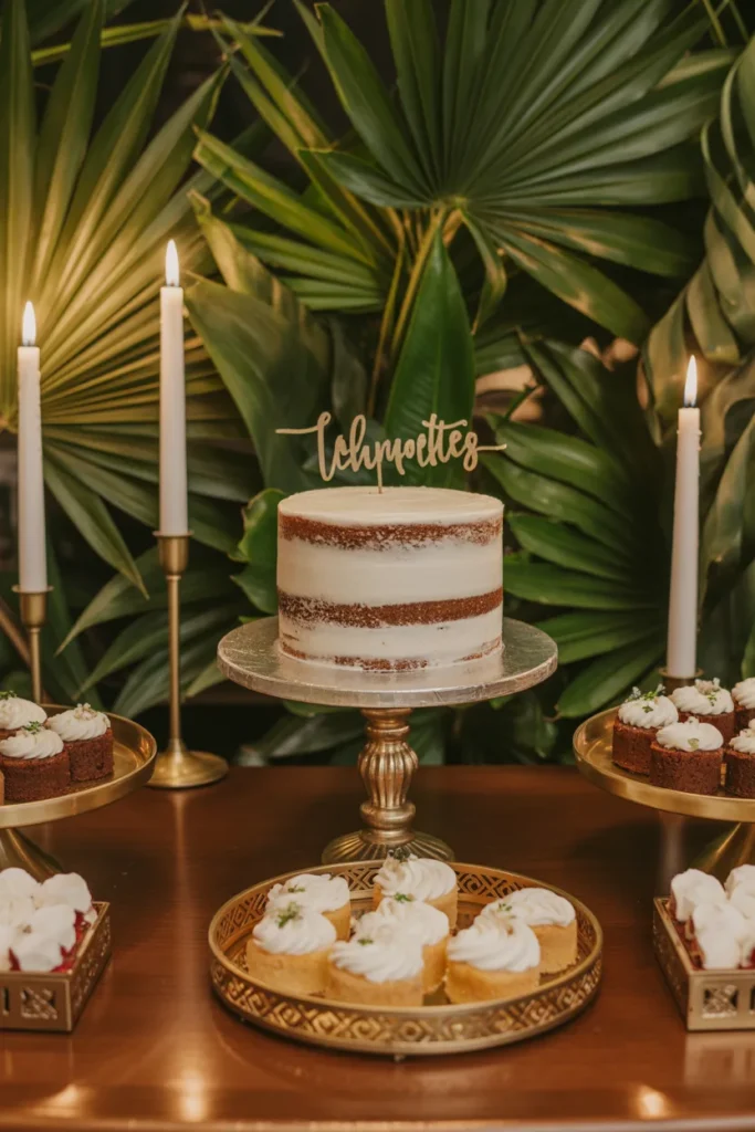 Elegant Dessert Display with Tropical Backdrop