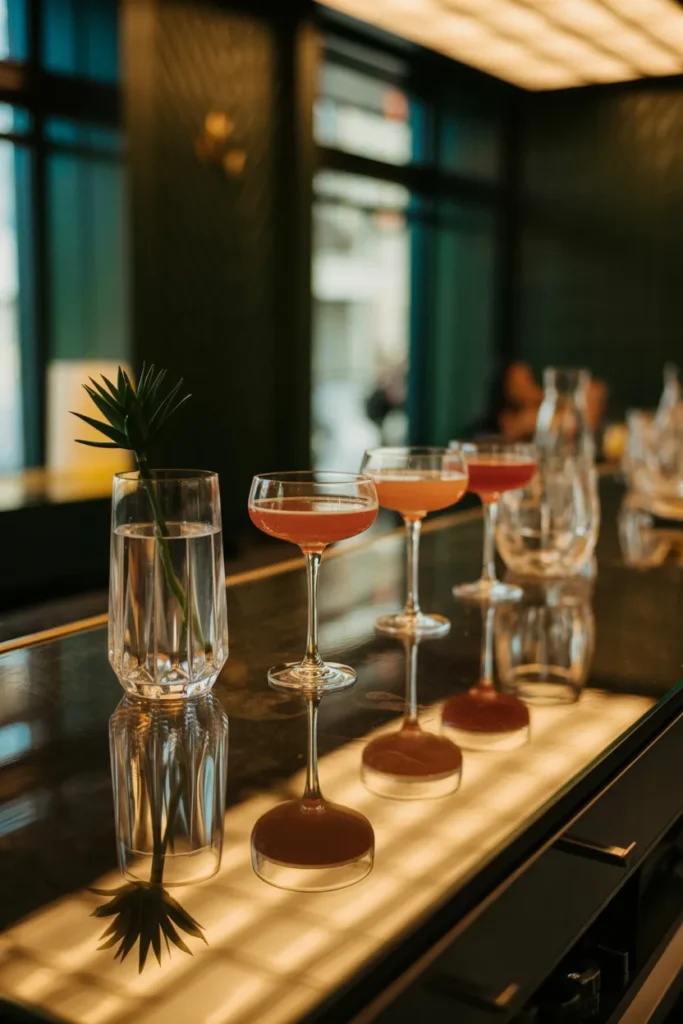 For a lively touch, I style a bar with matching signature cocktails. It’s fun, modern, and instantly elevates the party energy.