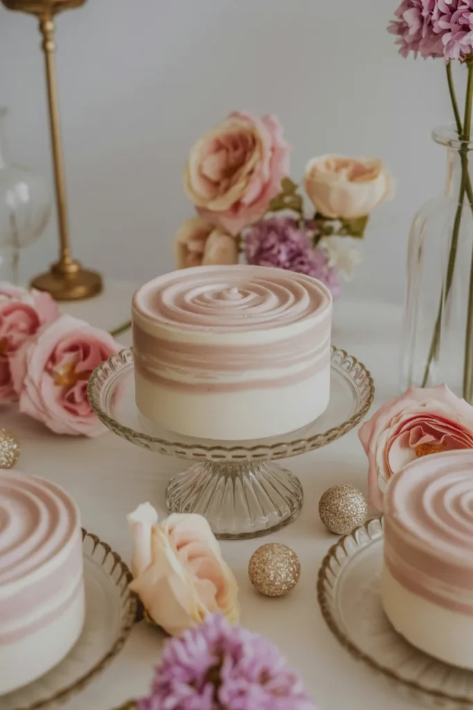 For a luxurious touch, I combine lush green palms with pastel flowers behind a tiered cake. Gold trays of sweets and clusters of candles add elegance.