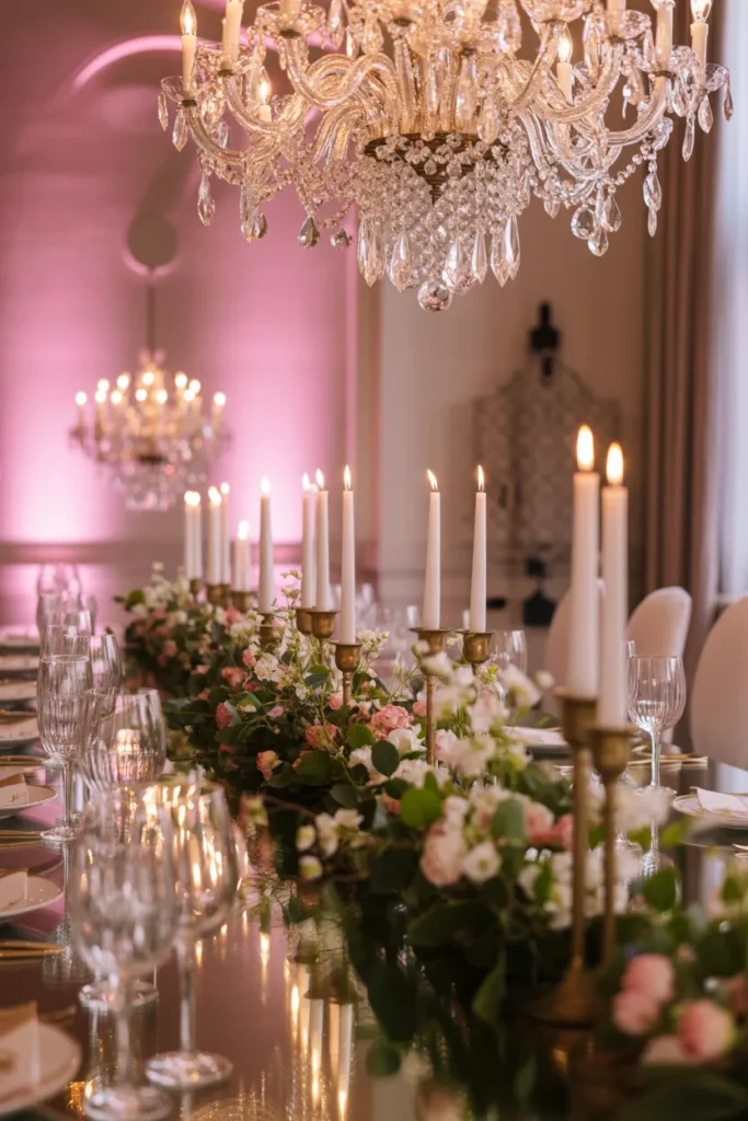 If you want a dramatic dinner, I recommend a chandelier-lit table with banquet seating, floral runners, and hanging crystal decor. Pink and purple uplighting turns the space into a fairytale.