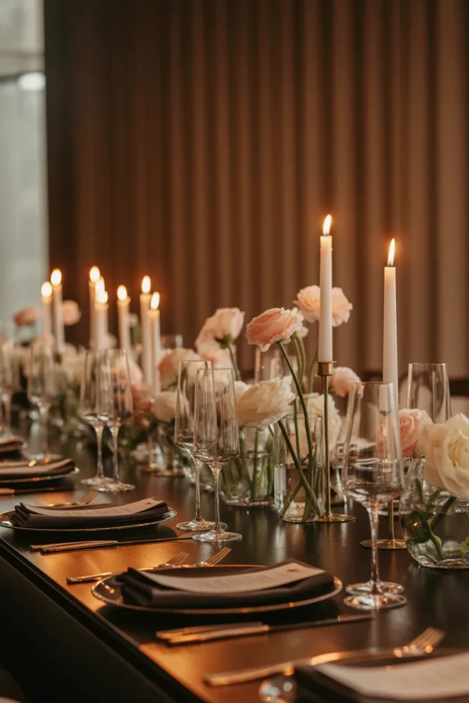 I pair tall glass floral stands with slim candles and low flower arrangements for a sophisticated dining vibe. Dark tablecloths contrast beautifully, making candlelight pop.
