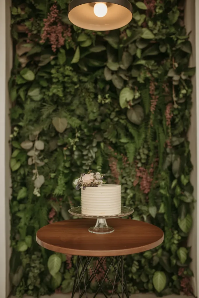When I host smaller gatherings, a cozy cake corner works perfectly. I pair a greenery wall with a simple wooden table and a white cake topped with custom details. A warm overhead globe light makes the setup feel soft and inviting.