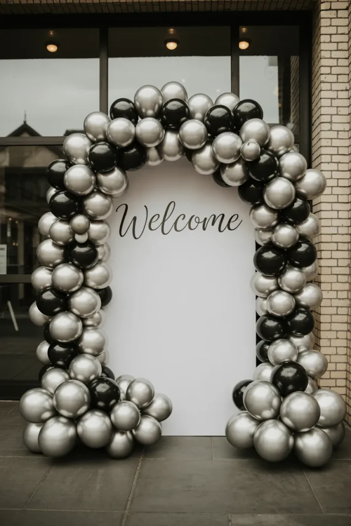 A monochrome balloon arch around a welcome sign adds a classy touch to intimate indoor parties, keeping the look modern and elegant.