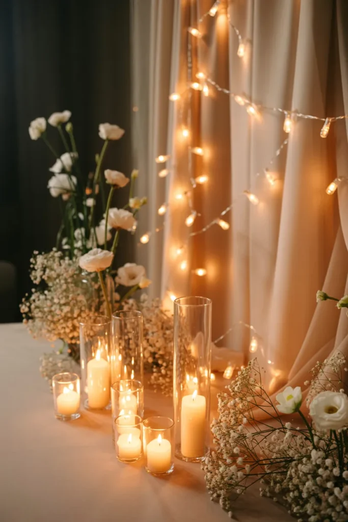 For a warm and intimate vibe, I set up tall white panels in front of flowing drapes, with flower clusters at different heights. Slim candle stands in the center and layered fairy lights above cast a golden glow that’s perfect for photos.