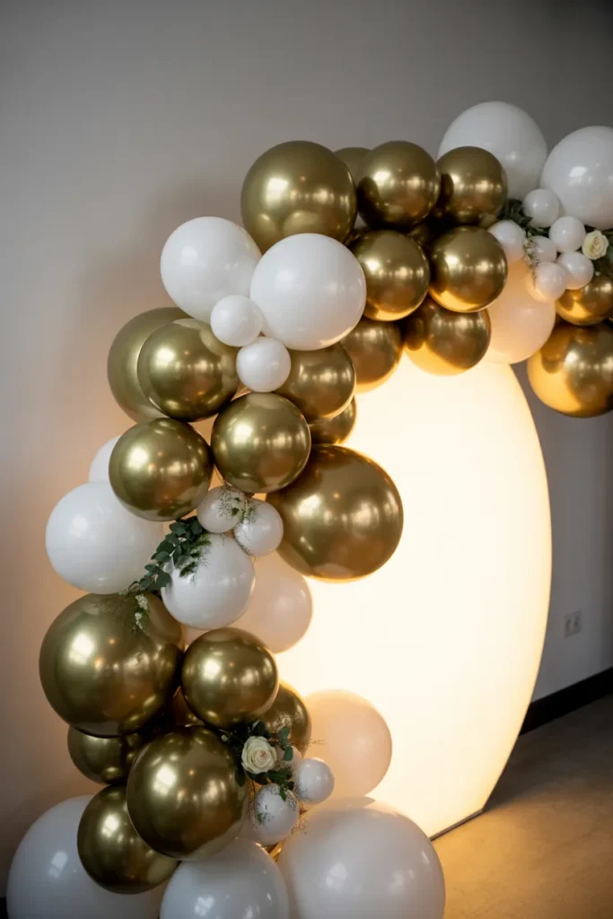 I’ve found that simplicity can be impactful. Gold and white balloon clusters with a custom name board and scattered petals create a fresh, modern feel