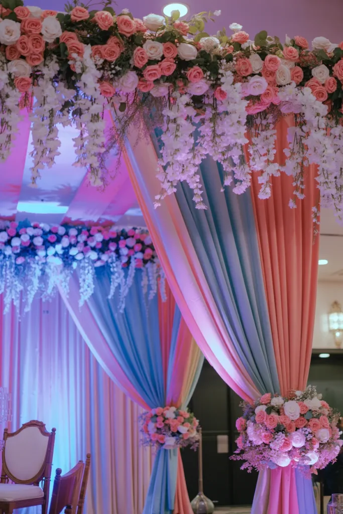 For a grand party, I frame the stage with pastel drapes, hanging flowers, and a garland of pink blooms across the top. Layered uplighting in cool and magenta tones highlights the flowers and creates a royal vibe.