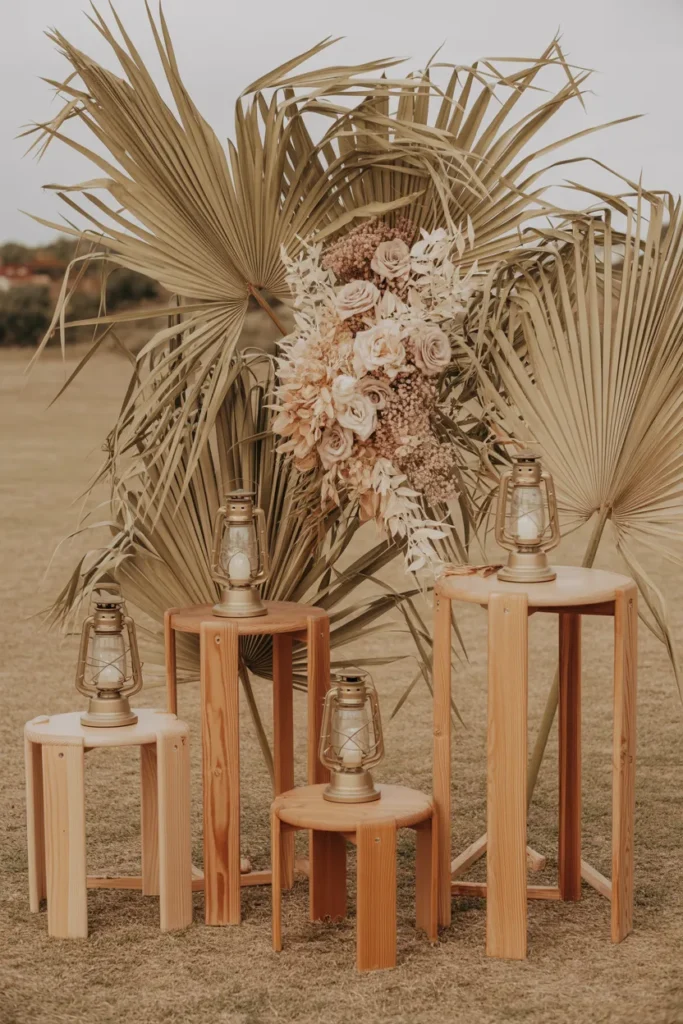 I love rustic boho setups for earthy, relaxed vibes. Dried palm leaves with blush flowers on wooden stands and lanterns at the base make the space warm and stylish.