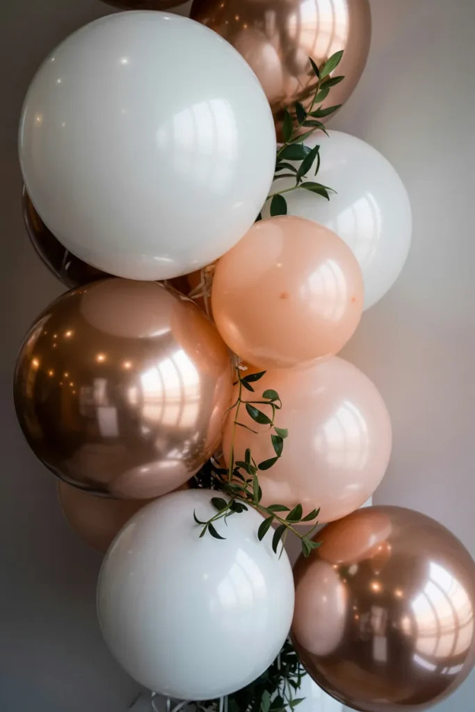 I’ve noticed that white balloons with rose gold accents instantly elevate a setup. Adding oversized metallic spheres and large LOVE letters makes the scene both modern and romantic.