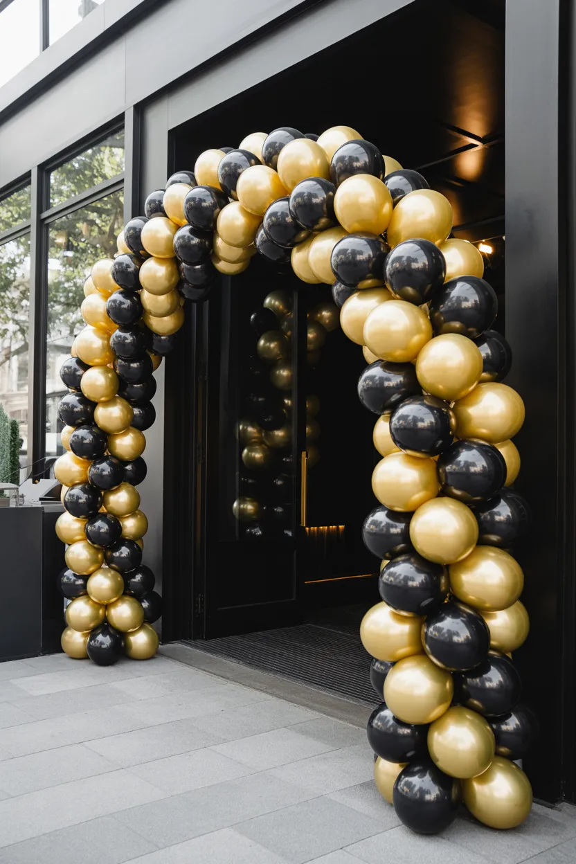 I like this idea because it instantly sets a classy tone. A simple black and gold arch at the entrance creates a strong first impression without needing too much decoration.