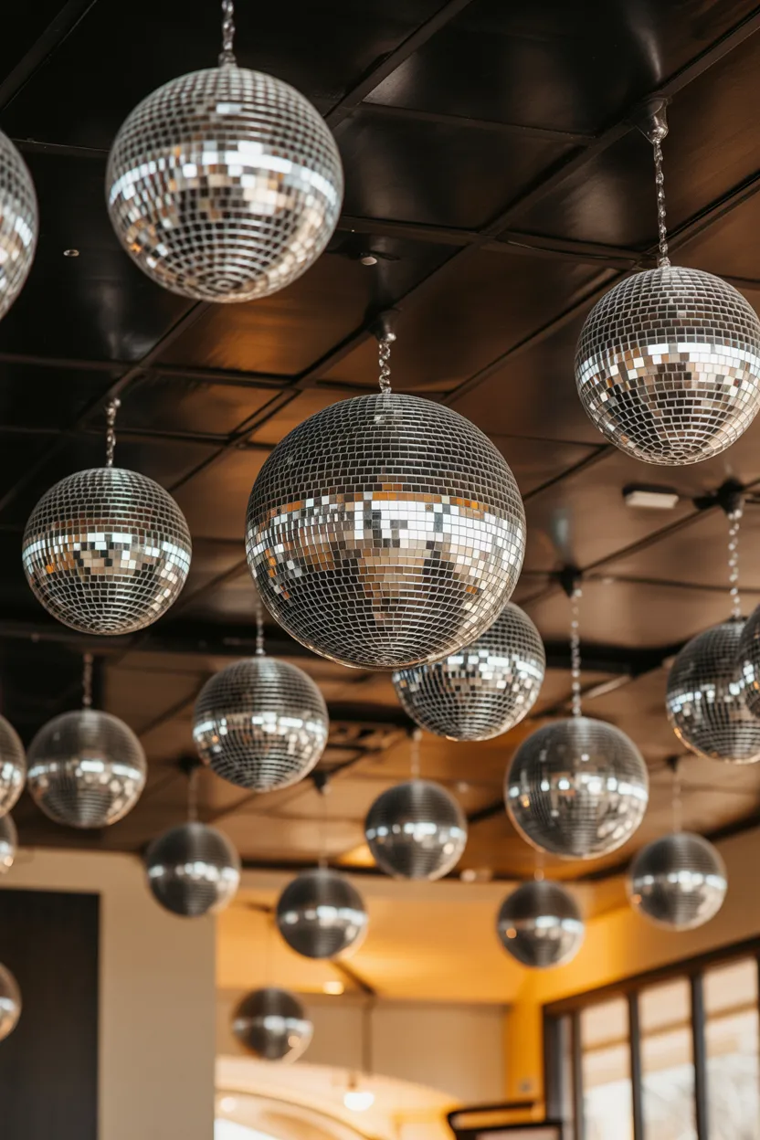 This idea brings instant energy. Hanging disco balls creates reflections that make the space feel lively.