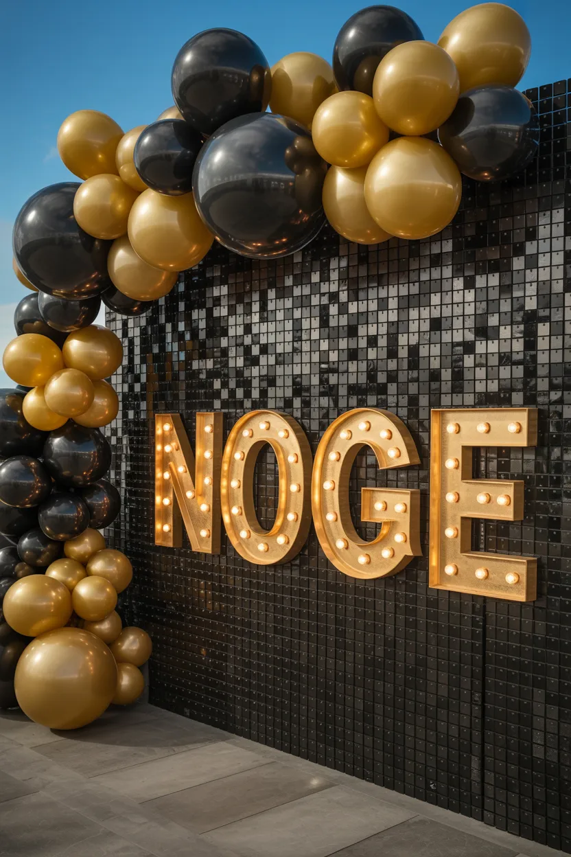 This works well when you want a strong focal point. The combination of a sequin wall and gold balloons creates a bold look.
