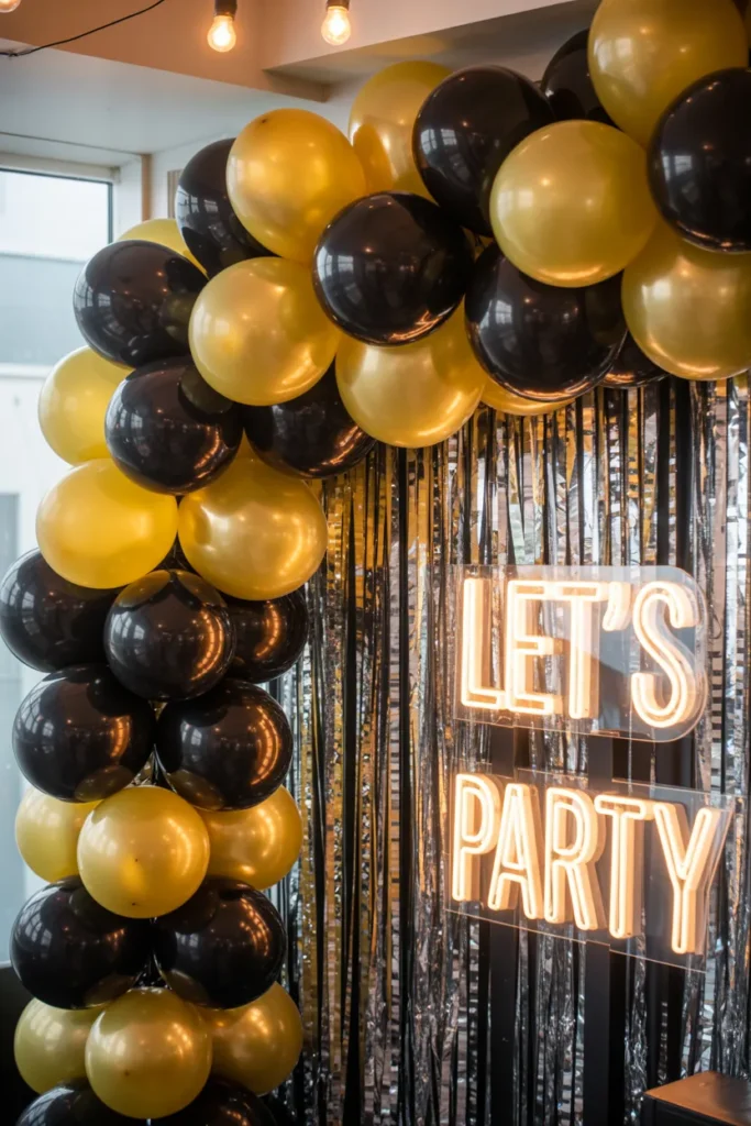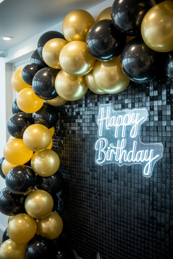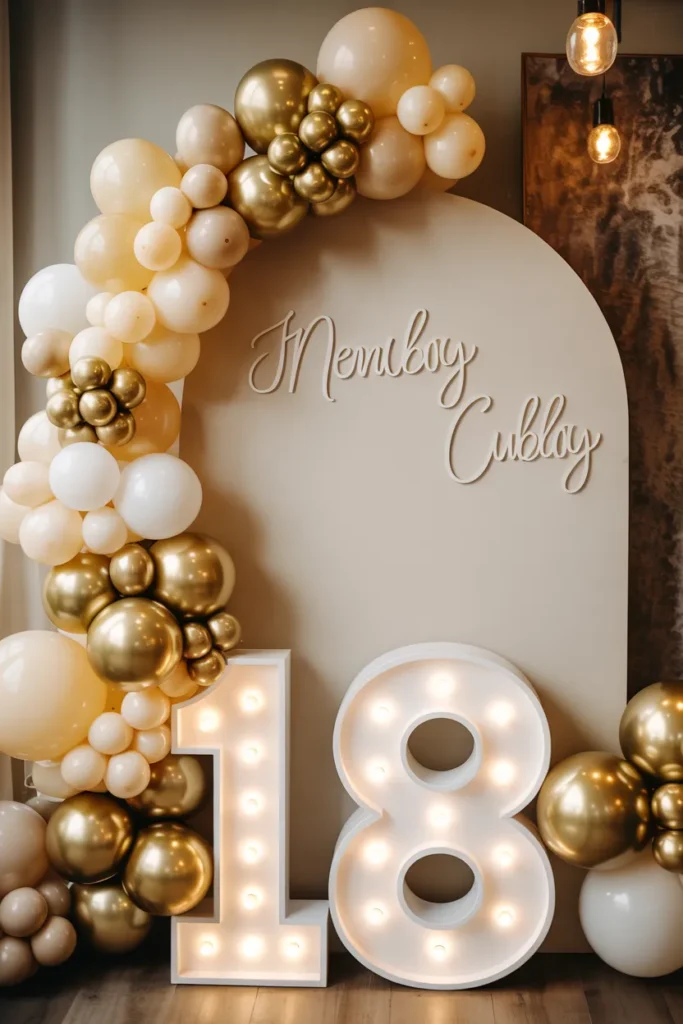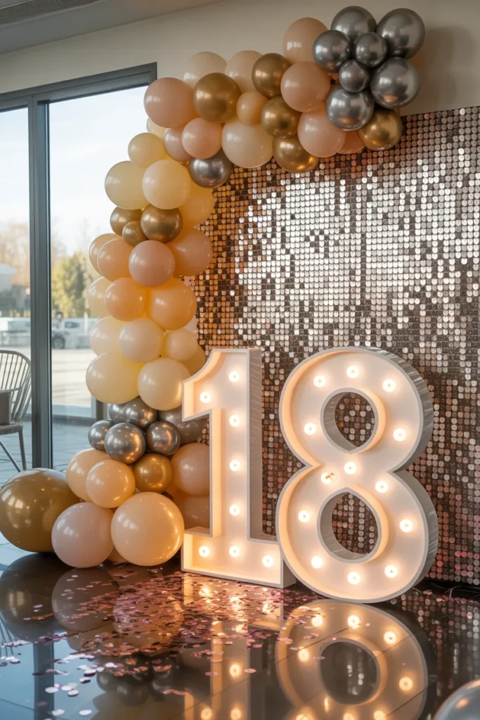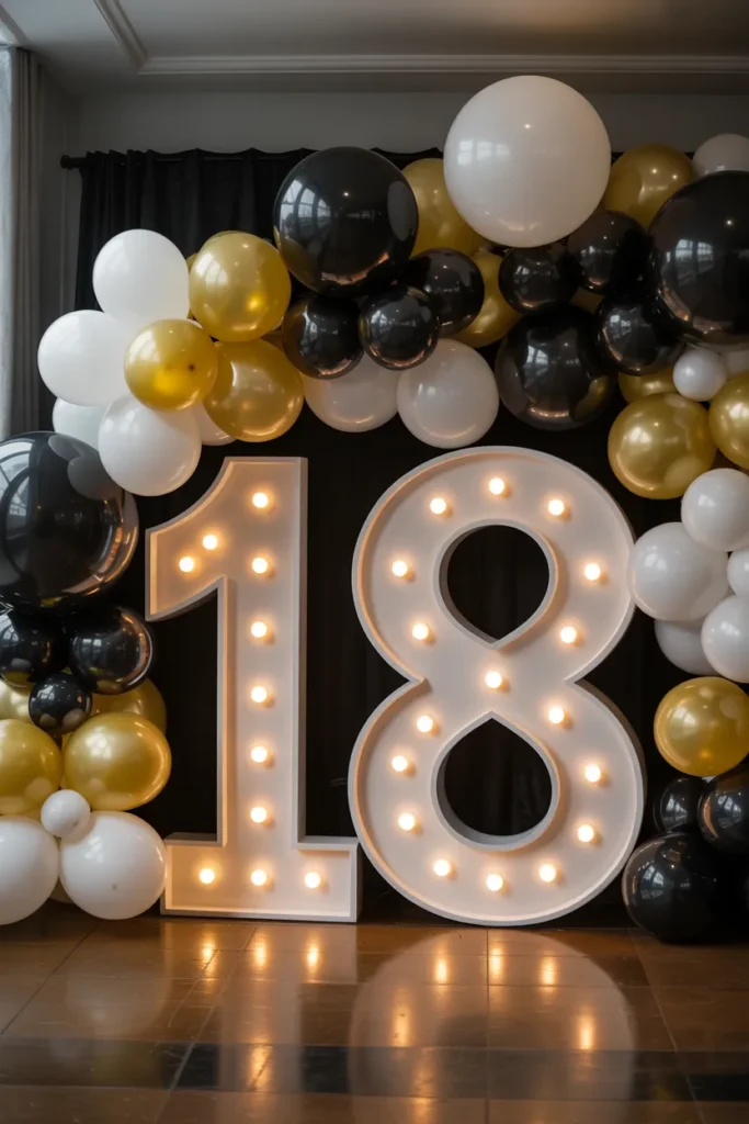 If you want the 18th to feel like a night out, black and gold balloons with a silver shimmer backdrop create a club vibe. Neon signs and marquee lights set the party-ready mood.