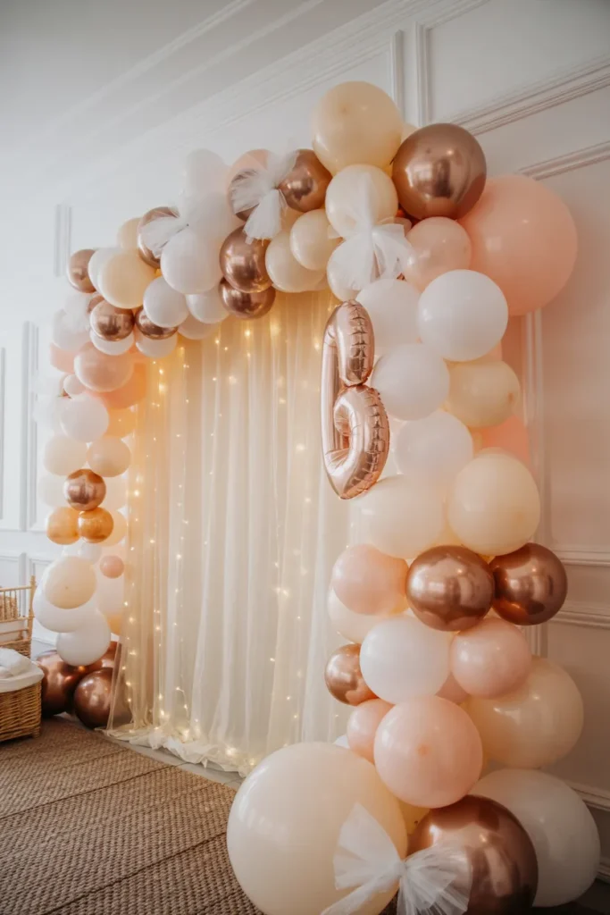For a feminine touch, I used blush, white, and rose gold balloons with tulle bows and glitter 18 numbers. Layered fairy lights gave a soft evening glow.