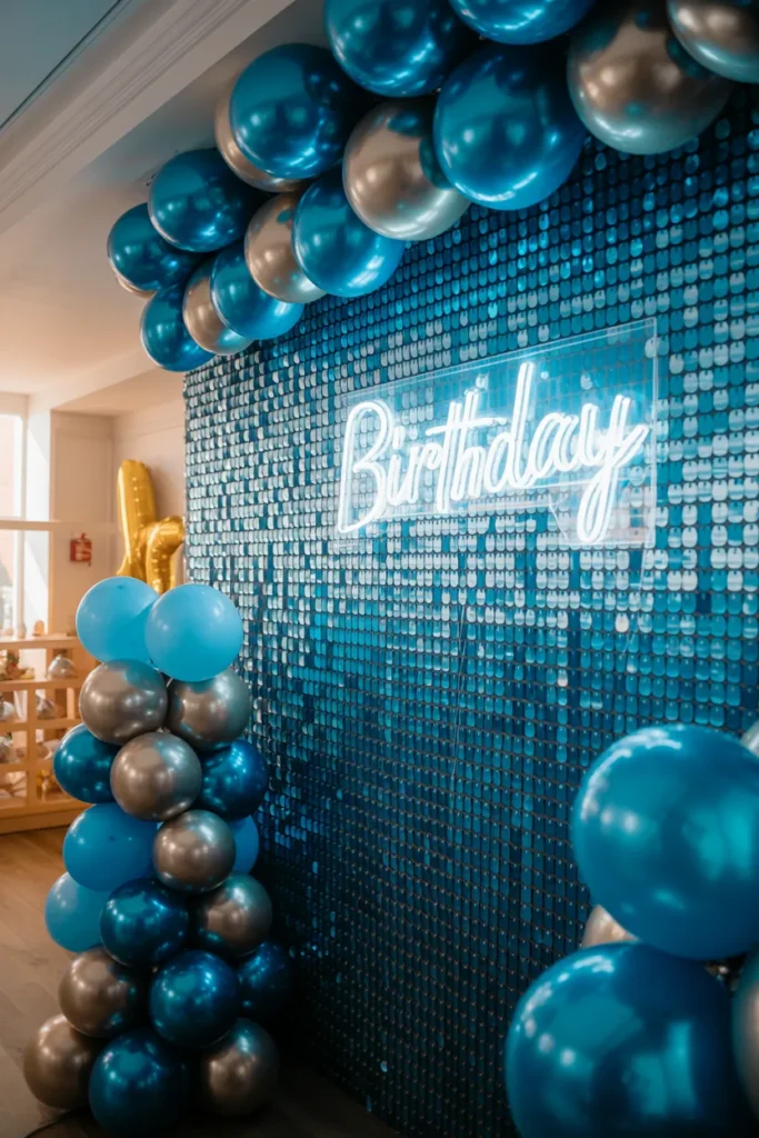 I love using a sparkling blue sequin wall with bold palm arrangements for a luxury indoor vibe. Metallic balloons on the sides and a neon birthday sign instantly make it feel like a photo-ready space.