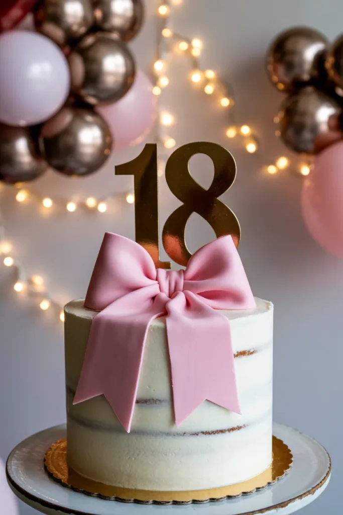 A white cake with a giant pink fondant bow and metallic 18 topper became my favorite photo moment. Framing the cake with balloons and warm fairy lights makes the cake-cutting ceremony feel magical.