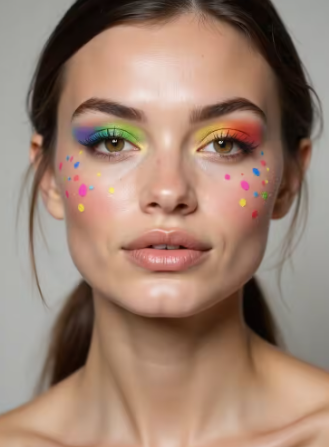 Small hearts or dots under the eyes add detail. White lashes or glossy freckles make the colors pop even more.