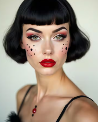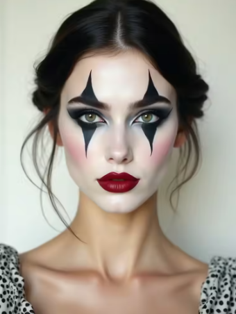 Vintage Pierrot makeup focuses on soft, pale skin and delicate details. A light base is blended smoothly for a porcelain effect. Thin brows and a small downturned mouth shape add a classic mood.