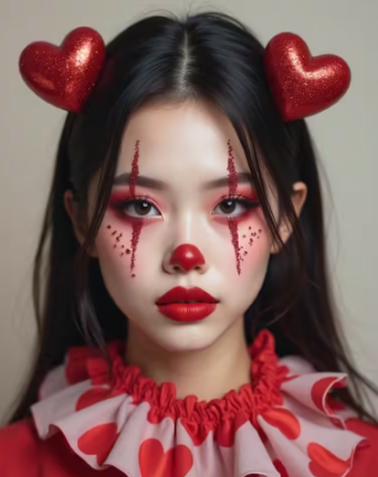 E-girl clown makeup features small floating hearts above the cheekbones. Thin eyeliner wings frame the eyes.