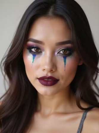 Glitter tear jester glam focuses on sparkle and strong face structure. Shiny teardrop shapes are placed under the eyes to catch the light. Metallic contour lines shape the cheeks and jaw for a bold effect.