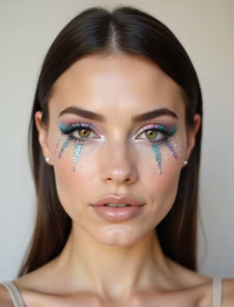 Sparkling teardrop accents sit just under the eyes. A thin brush draws soft drip shapes, and glitter is pressed on top for shine. The drops can be small and simple or layered for more drama.
