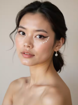 The lids stay mostly bare so the liner becomes the main focus. Glossy freckles or a soft lip keep the look playful.