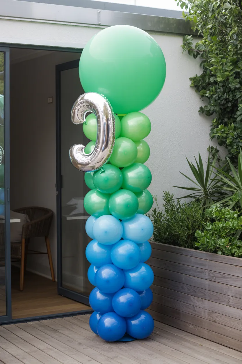 Perfect for patios or small spaces, a balloon column with green and blue gradients plus a single number balloon creates a simple yet cute focal point. Daylight highlights the colors without extra decor.