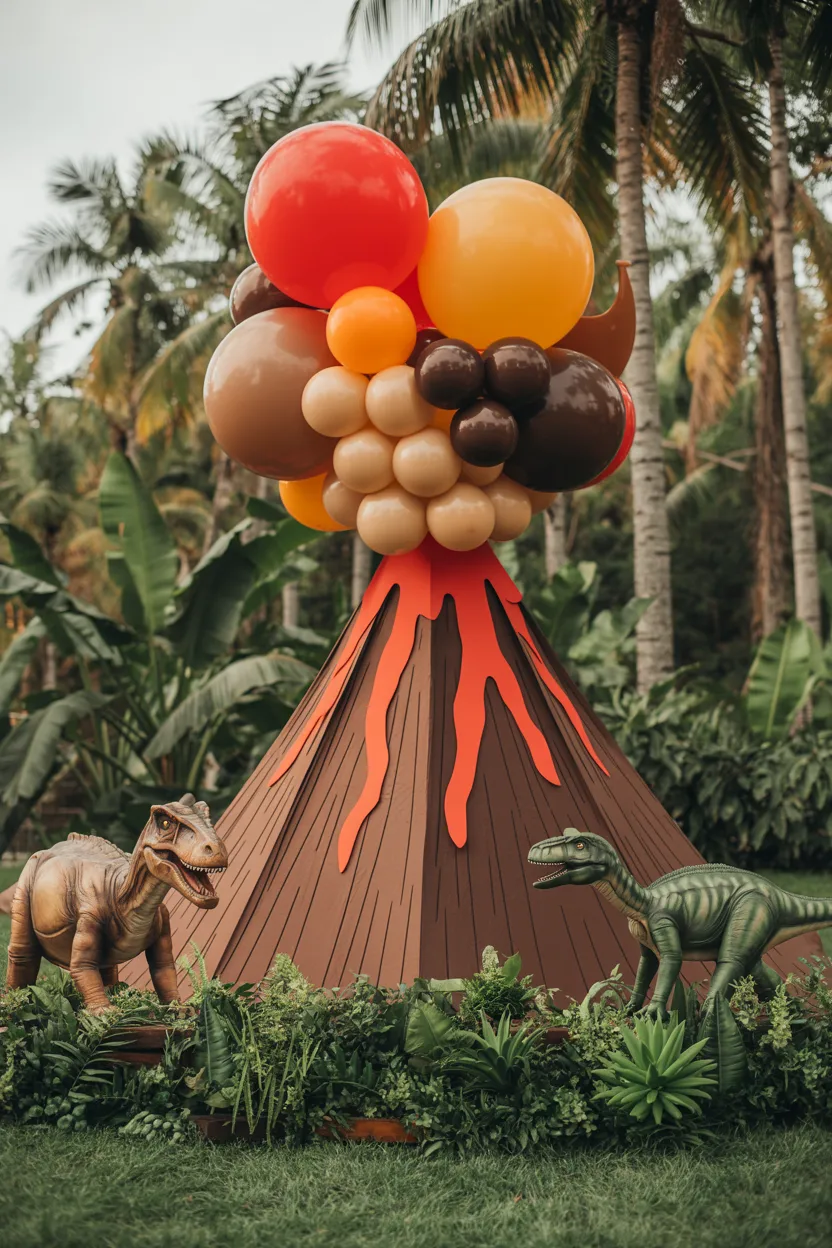 For a big adventure vibe, I create a volcano effect with red, orange, and brown balloons, balanced with green clusters. Surrounding the base with faux plants and dinosaurs brings the scene to life. Tip: Works best in larger indoor spaces with overhead lighting or natural daylight.