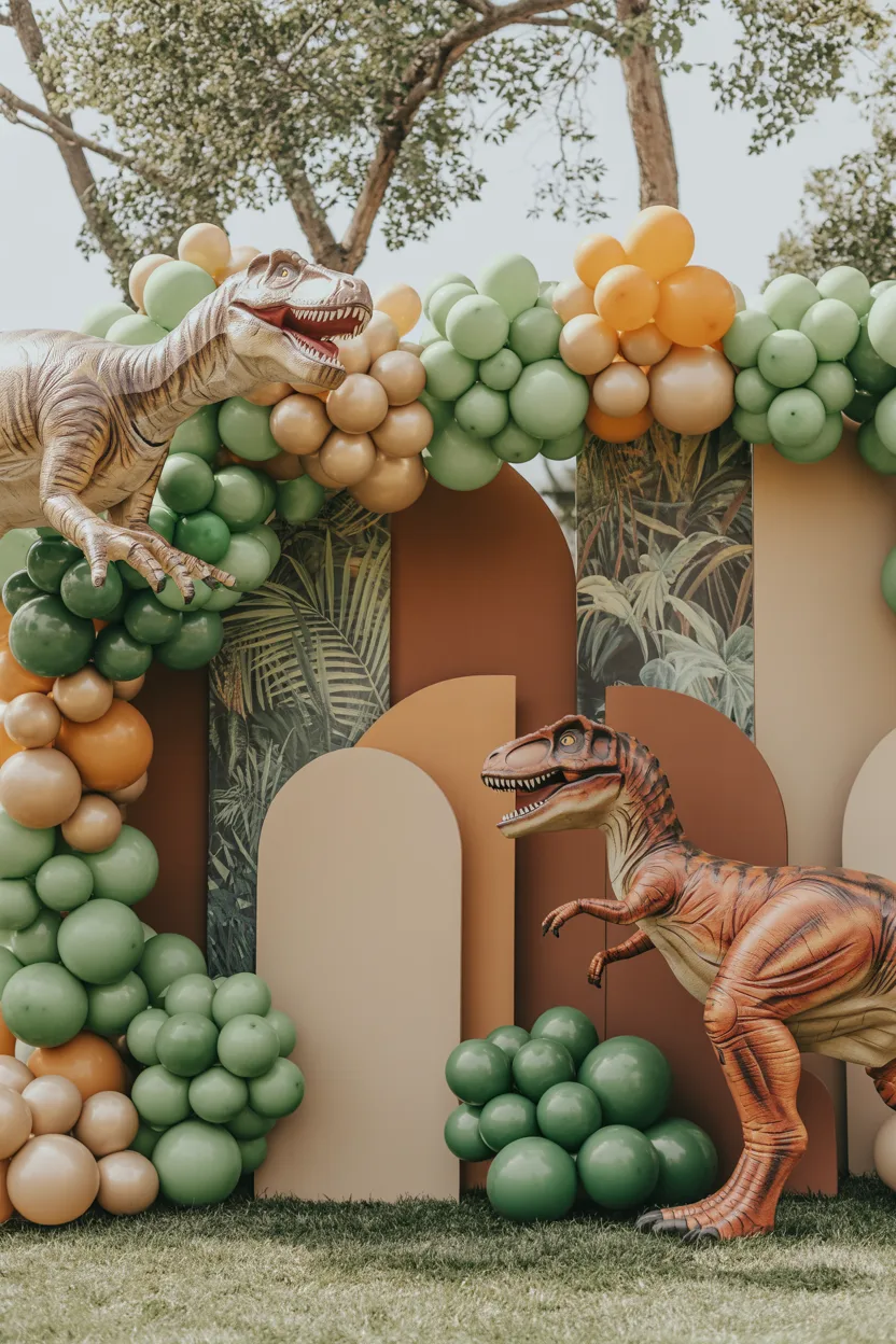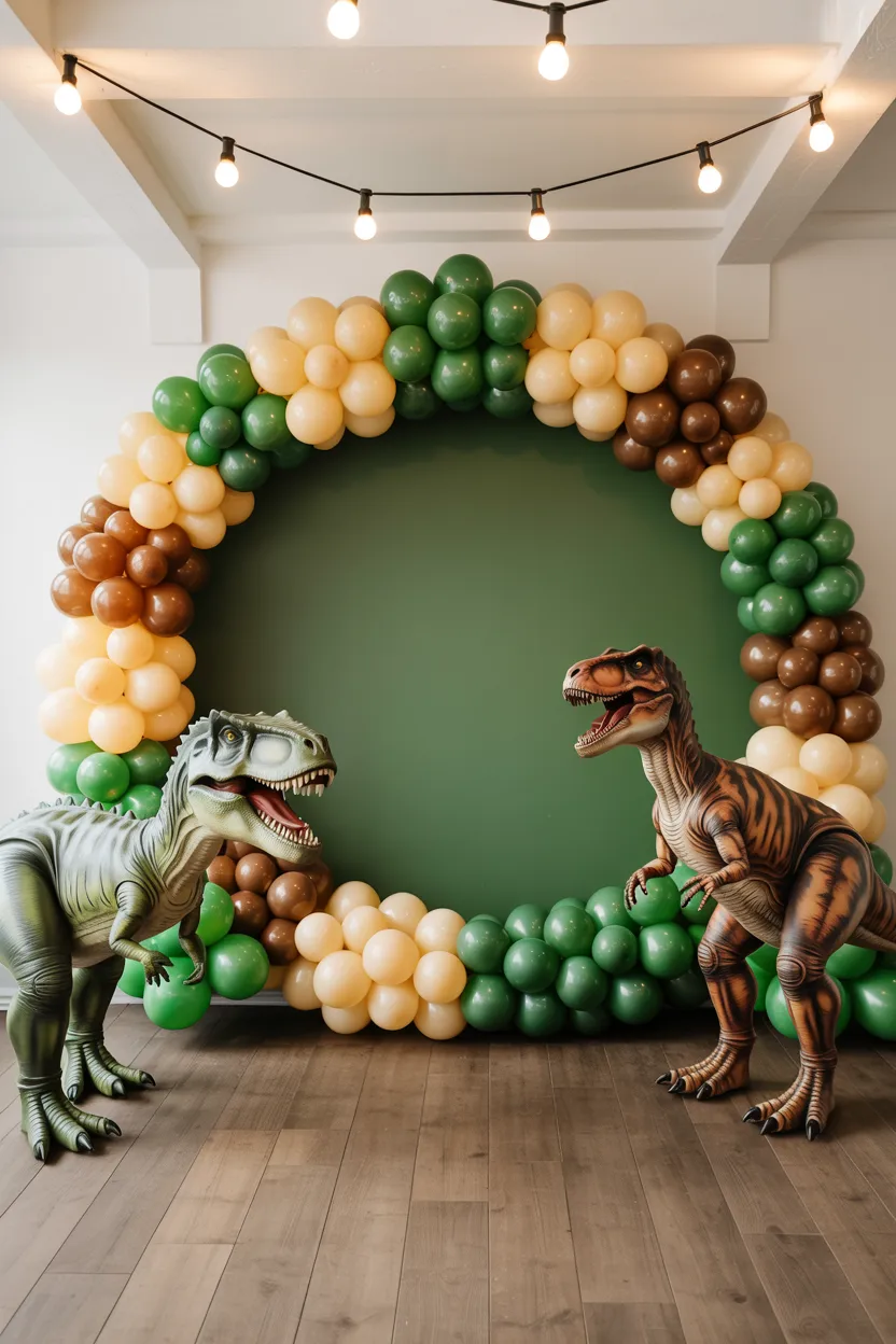 A roaring T-Rex backdrop near the entrance immediately excites guests. I pair earthy green, brown, and beige balloons with leaves and a large T-Rex cutout. String lights tucked behind the balloons highlight the arch, giving it drama in photos.