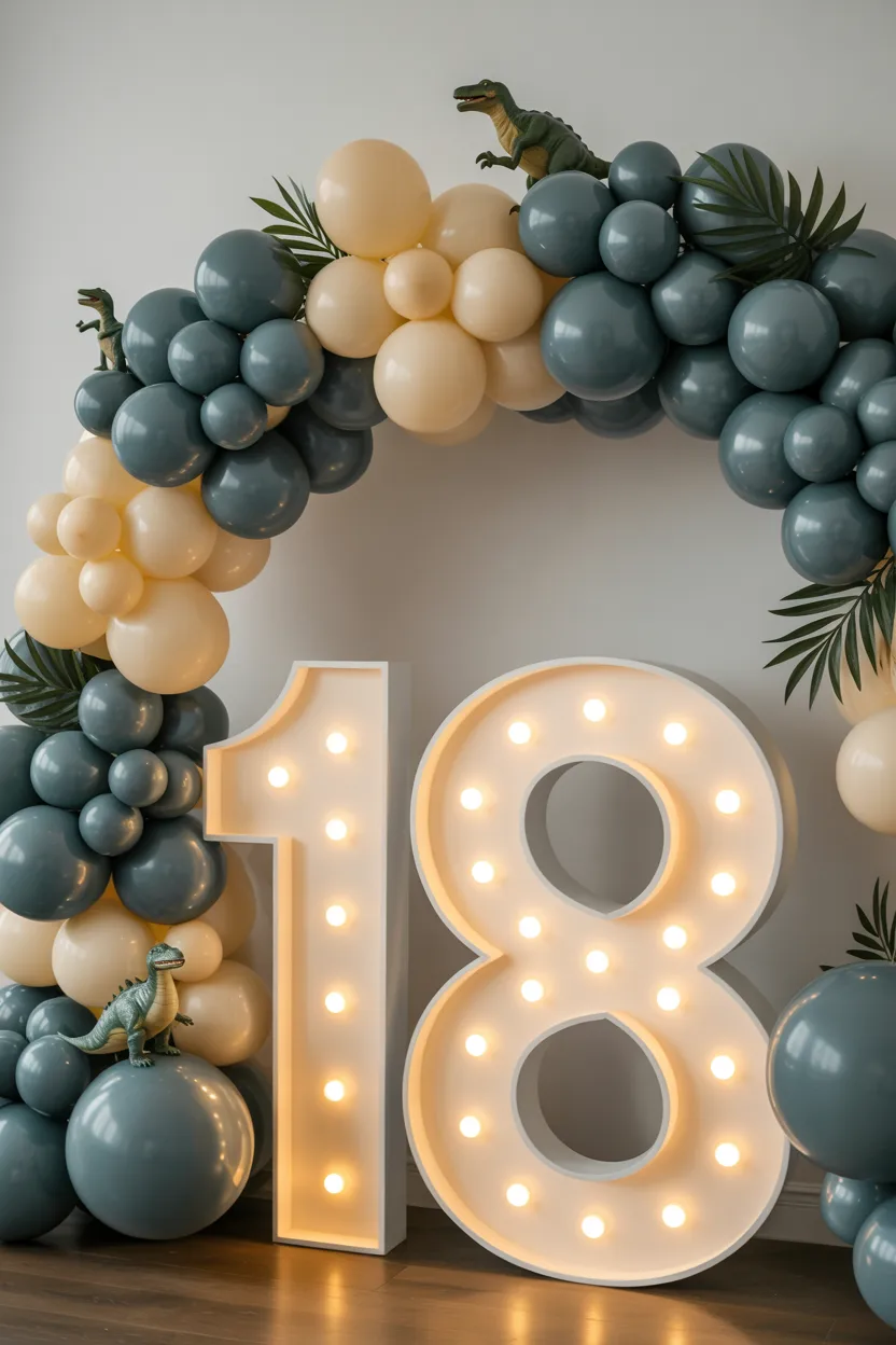 Perfect for first birthdays, this setup uses pastel green, beige, yellow, and blue balloons with playful dino cutouts. A large light-up number becomes the centerpiece. Indoor soft lighting keeps the colors balanced.