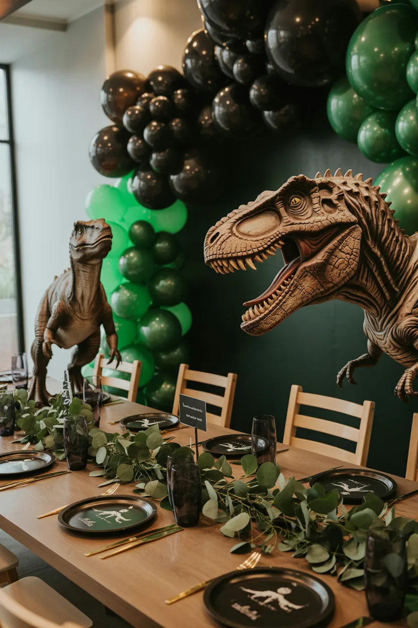 A darker, cinematic look with life-like dinosaur cutouts and dark balloon clusters creates a realistic Jurassic vibe. Adding greenery along the table center brings cohesion. Works best in indoor halls with space to spread out and soft accent lighting.