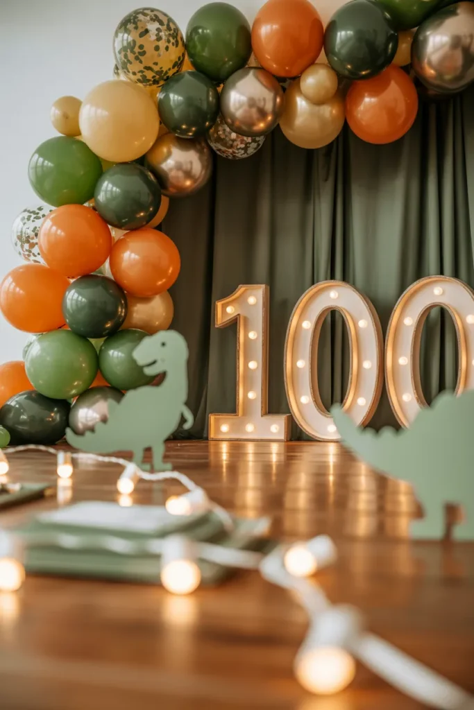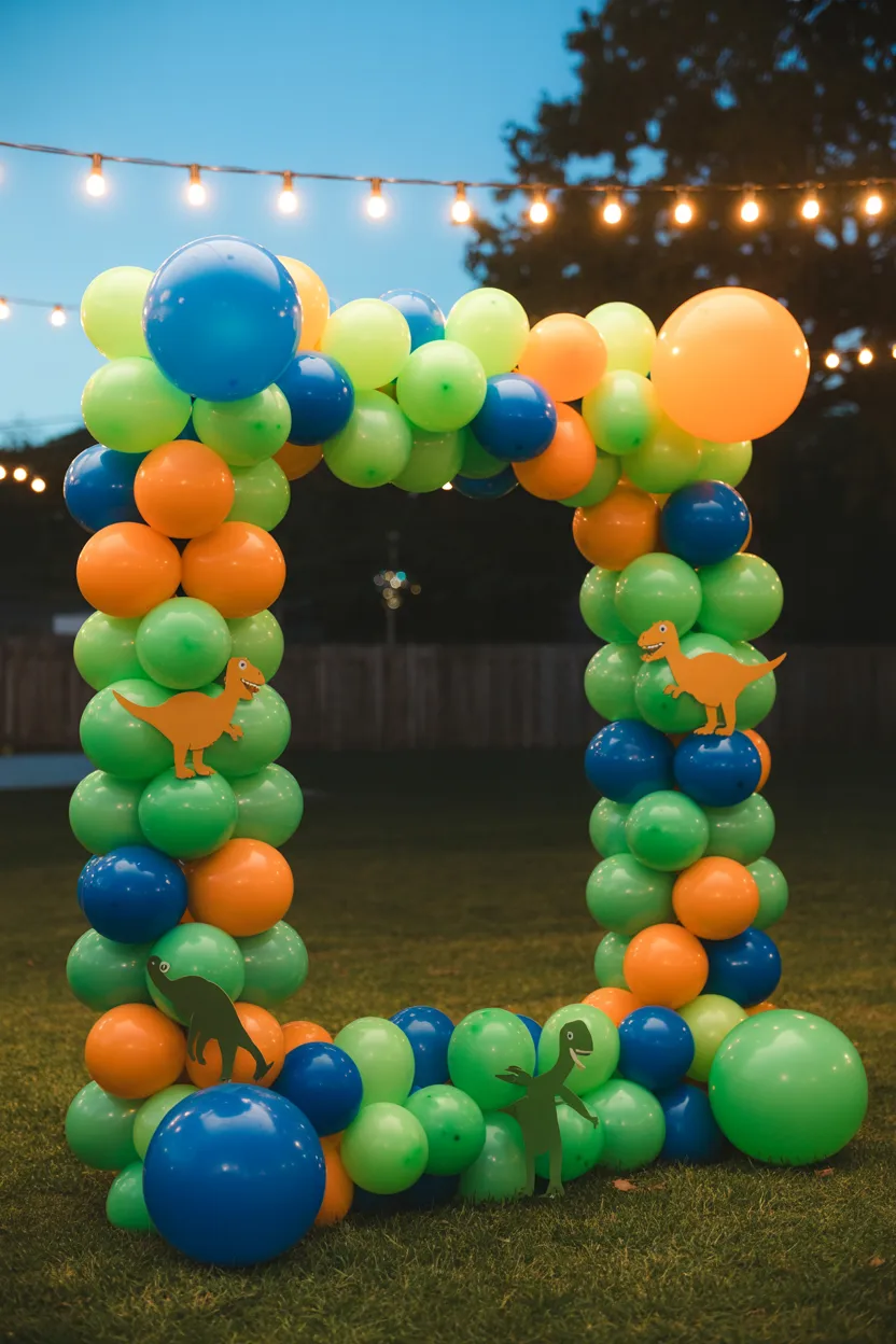I love using a bold balloon arch as a main photo spot. Mixing greens, oranges, and metallics with dino cutouts creates depth, while a marquee number adds a celebratory touch.