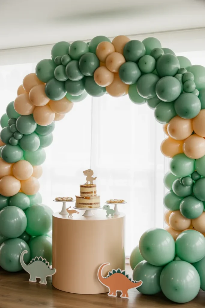 For a calmer vibe, I go for pastel teal and beige balloons. The arch frames the cake table nicely, and small dinosaur cutouts at the base add charm. Using soft white lights keeps the backdrop bright without being harsh in photos. Pro tip: Pastels work best in well-lit spaces.