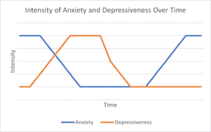 When depressiveness increases, anxiety may decrease for a while. Even though this can feel like a break from anxiety, most people strongly dislike feeling depressed. Eventually, depressiveness may lessen on its own or people may seek help. During this short period, both anxiety and depressiveness can feel lower before anxiety returns again and the cycle restarts.