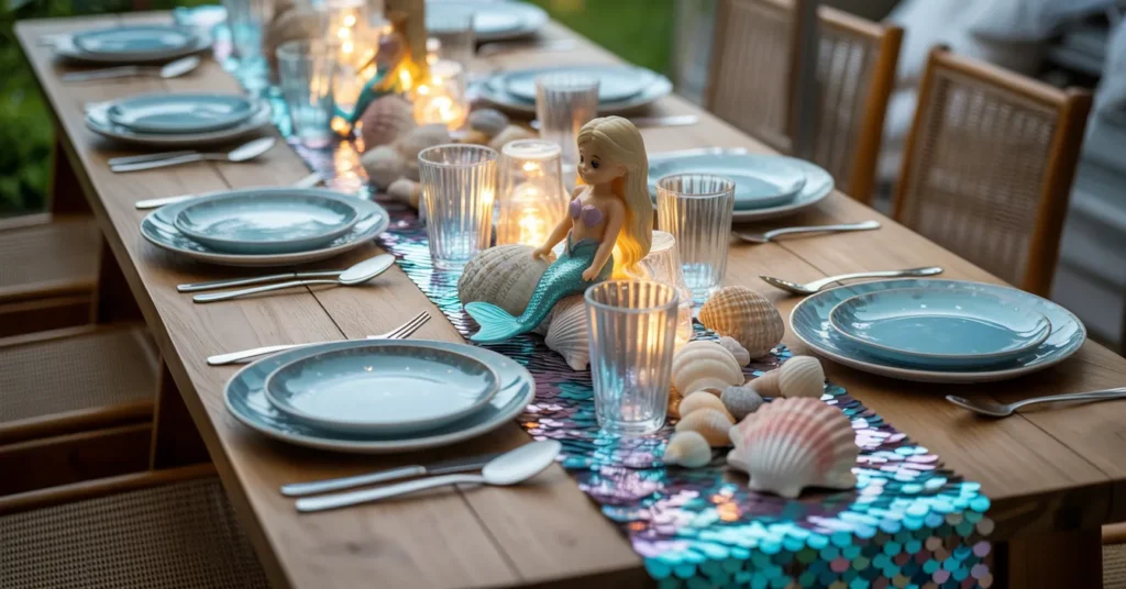 A shimmery sequin runner, seashells, and mermaid dolls tie the theme together. Iridescent plates and tail-shaped cutlery add cohesion. Soft daylight or string lights enhance the sparkle and make the table visually inviting.