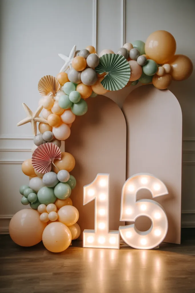 A tall balloon arch with pastel clusters and shell/starfish props draws attention to the birthday age. Fairy lights or soft spotlights highlight shimmer balloons and make the display feel festive and bright.