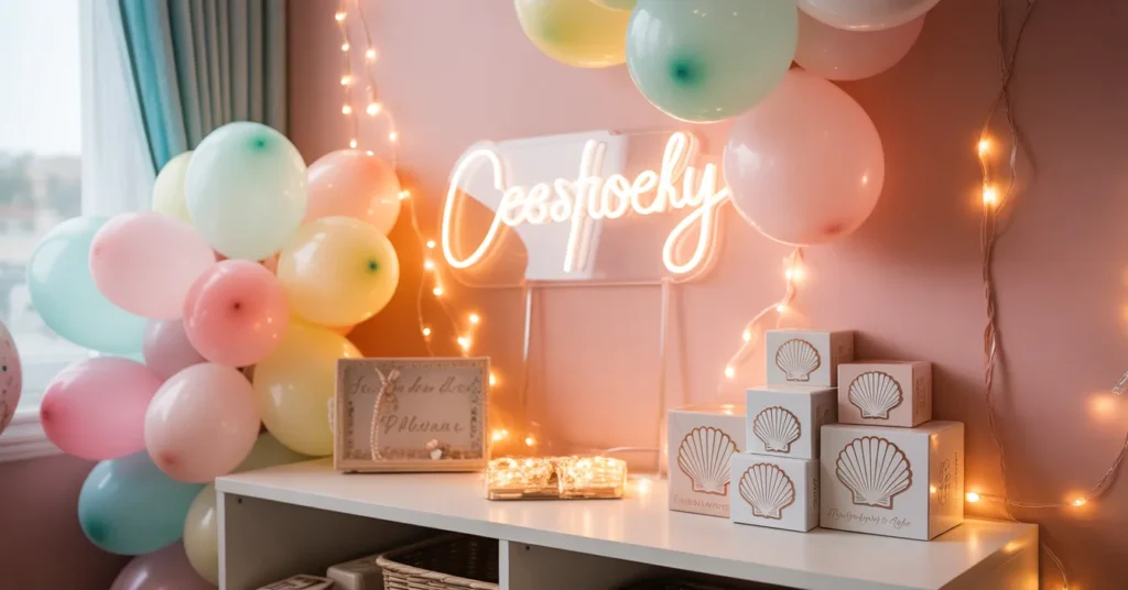 A cozy corner with pastel balloons, shell-themed favor boxes, and a warm neon sign creates a dreamy vibe. Gentle lighting keeps it elegant without overwhelming décor. This setup is perfect for intimate photo moments.