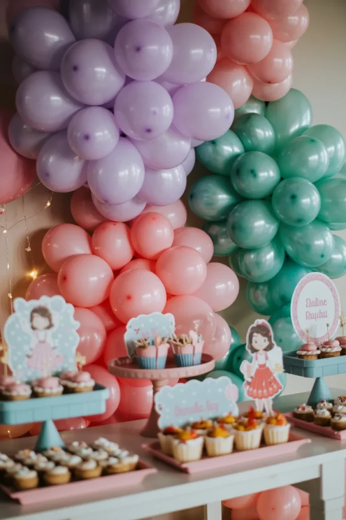 Layering lilac, teal, and pink balloons with iridescent details creates a whimsical dessert display. I add character props, themed desserts, and coral cutouts. Subtle fairy lights enhance shimmer and make the table the centerpiece.