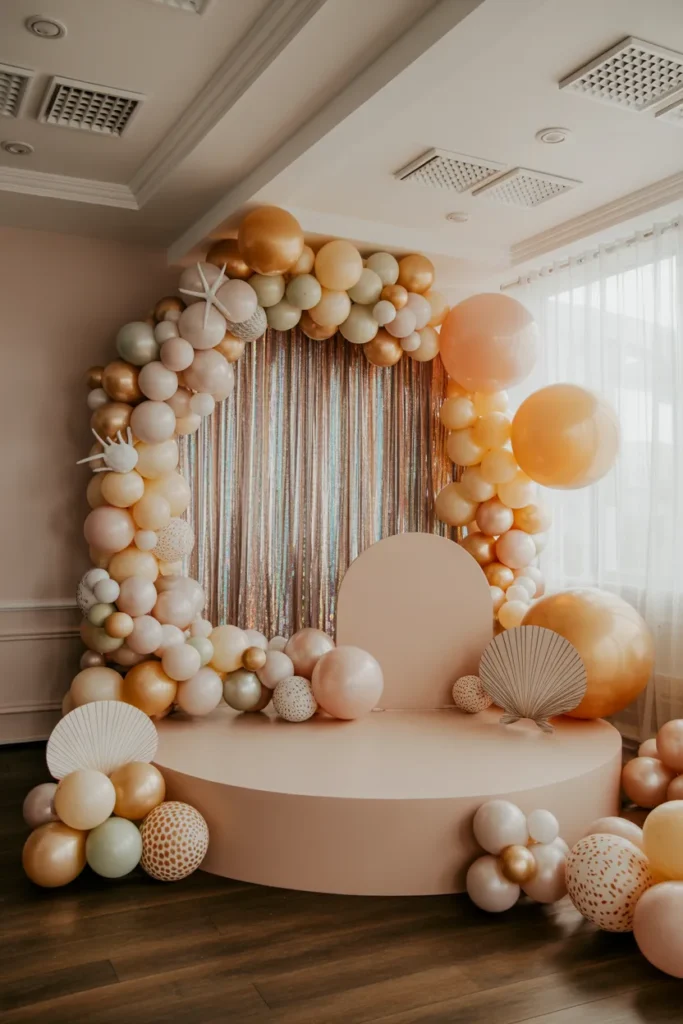Using soft peach, lavender, and lilac balloons around a sequin panel creates a cheerful stage. Coral cutouts and mermaid tails add dimension. Overhead or soft spotlights bring out the pastel shimmer effectively.