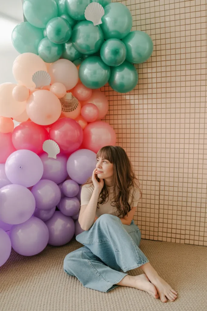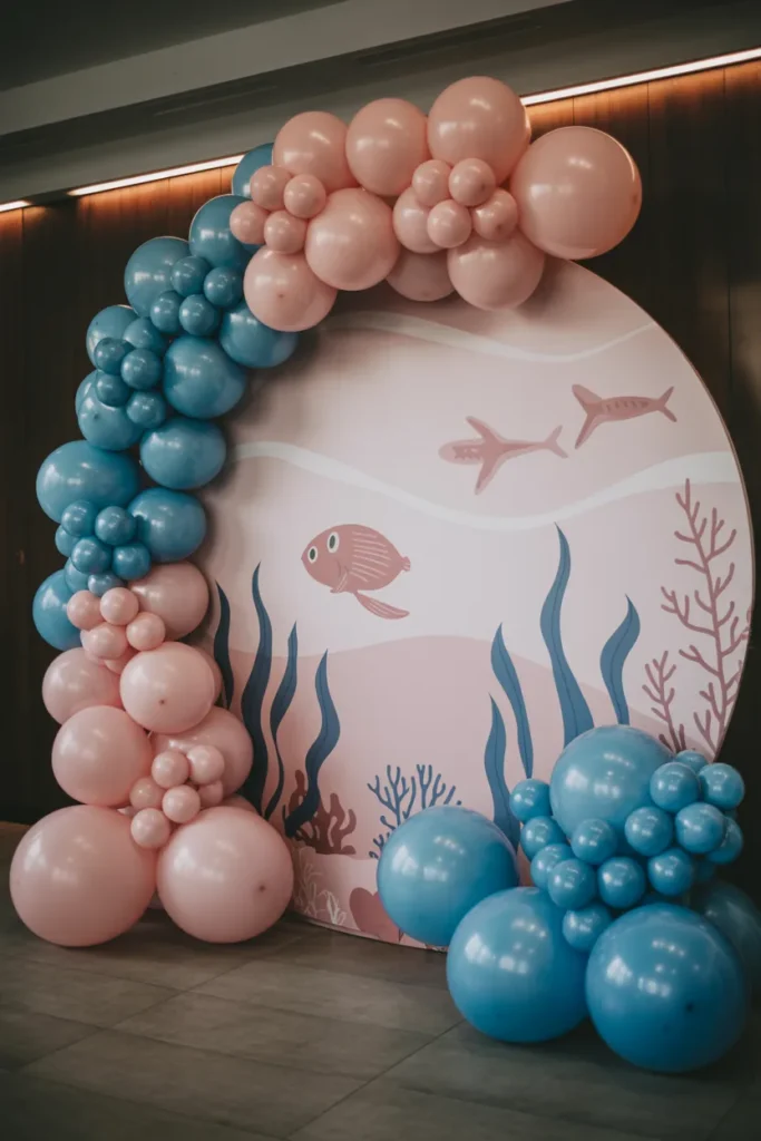 Combining teal, pink, and purple balloons with shimmer panels creates a bold underwater corner. I often add coral cutouts and inflatable shells for depth. Soft warm lights behind the setup make the scene glow, giving guests a magical experience.