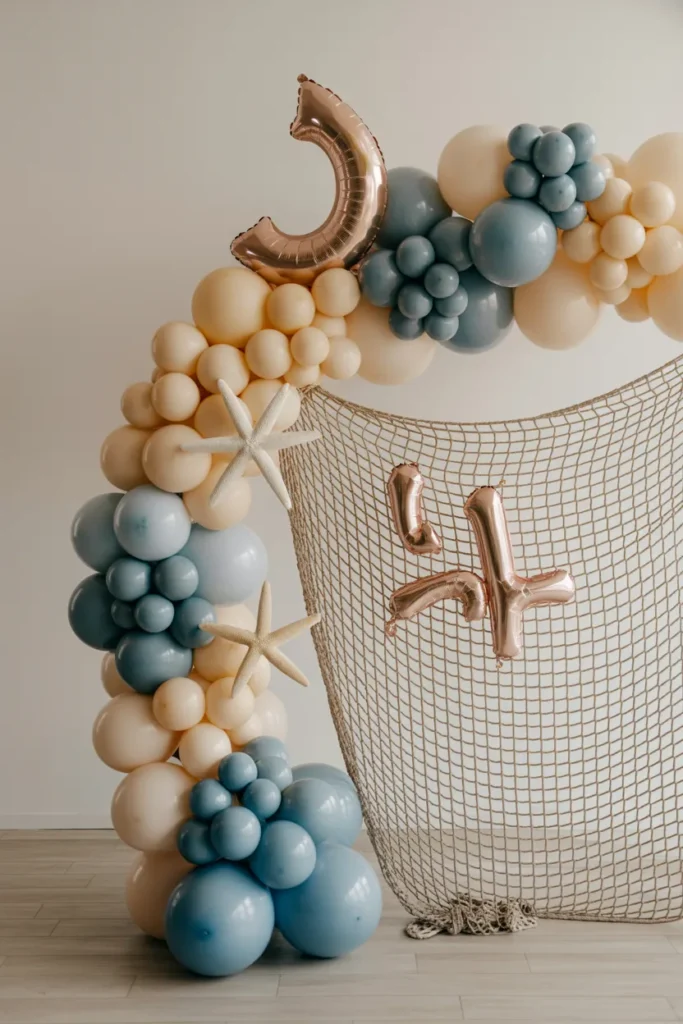 A pastel balloon arch with a shell accent immediately sets the tone. I usually mix soft pink, teal, and coral balloons, add iridescent panels, and tuck in fairy lights. Placing a pearl-painted shell at the base gives a subtle undersea glow. This setup not only frames the cake but also works as a photo-ready focal point.