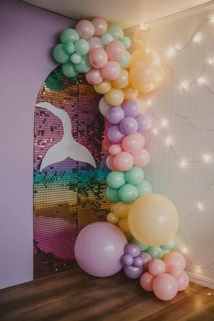 Even a small corner can shine with pastel balloon clusters and a sequin backdrop. A tail cutout anchors the theme, and fairy lights add a soft glow, making a simple space feel complete.