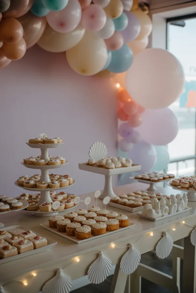 I like using dessert tables as a statement. Layered stands, pastel panels with shells and tails, and warm string lights make the desserts stand out. In my experience, varying heights adds dimension and makes the setup more dynamic and Instagram-ready.