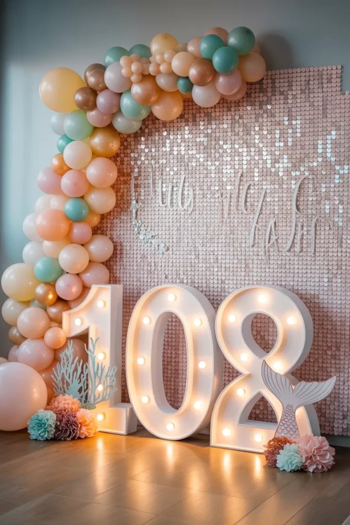 Sequin walls with glowing numbers instantly elevate the party. I layer pastel balloons and coral cutouts at the base, adding a large tail prop on top. Fairy lights tucked behind create depth and a subtle shimmer effect, giving the display a professional touch.