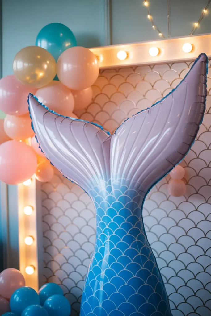 I love creating a mermaid tail backdrop because it becomes the main photo area. Pair scallop-patterned boards with pastel balloons and position the tail prop at the base. Adding uplighting or fairy lights gives it a shimmering effect that captures the underwater theme beautifully.