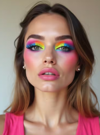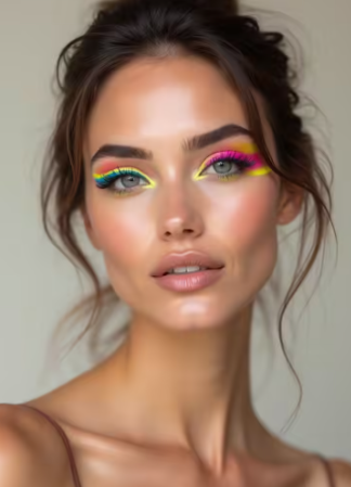This look focuses on sharp lines and electric color. Map the crease with a cream base, then press neon pigment like lime, orange, or violet on top.