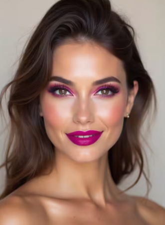 A full magenta look feels sleek and powerful. Sweep the same rich shade across lids, cheeks, and lips for a smooth and unified finish.